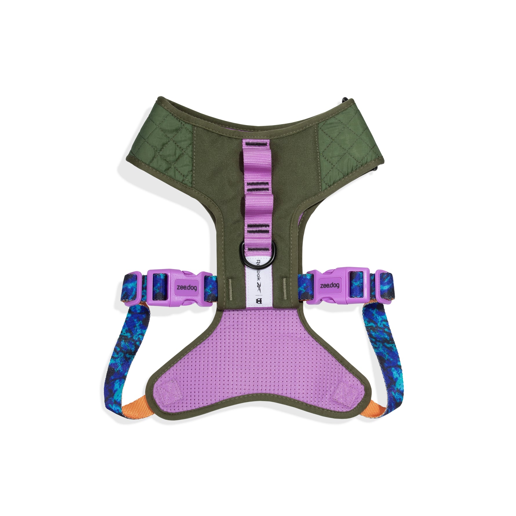 La palette unisce verde bosco, tonalità violacee e accenti arancione, richiamando l’equipaggiamento da trekking e i materiali high-performance. Il pattern, ispirato alle texture naturali, crea un look dinamico e moderno, perfetto per la vita all’aria aperta e l’uso quotidiano.